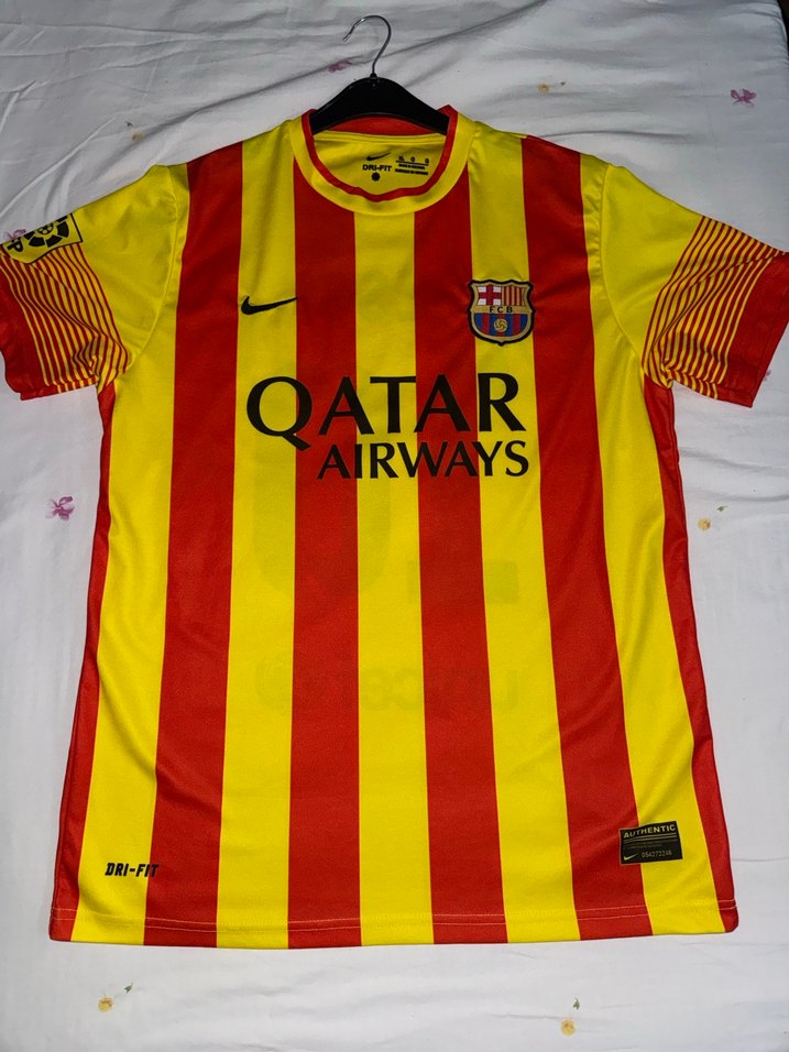 Sarı ve kırmızı çizgili, kısa kollu, bol kesim erkek spor forması. Sentetik kumaştan, bisiklet yaka ve drapeli detaylı. Önünde QATAR AIRWAYS baskısı ve Nike ile FC Barcelona logosu bulunur. ⚽