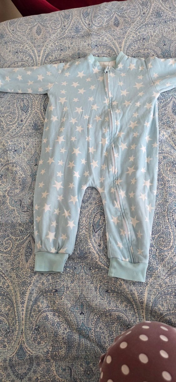 Pastel mavi renkte, uzun kollu ve yüksek yakalı bebek tulumu. Fermuarlı ve yumuşak 1 tog değerindedir