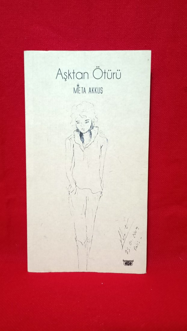 Meta Akkuş'un Aşktan Ötürü adlı romanı, üzerinde bir kişinin çiziminin bulunduğu kapakla sunuluyor. Kitap orjinal bandrollü ve sıfır piyasada baskısı bulunmayan nadir kitaplardan