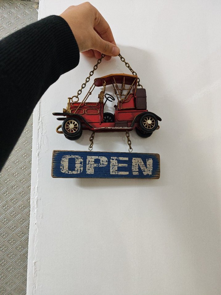 Renkli kırmızı oyuncak araba ve altında asılı 'OPEN' ters çevirince de "CLOSED" tabelası. Nostaljik tasarımı ile dikkat çeker.