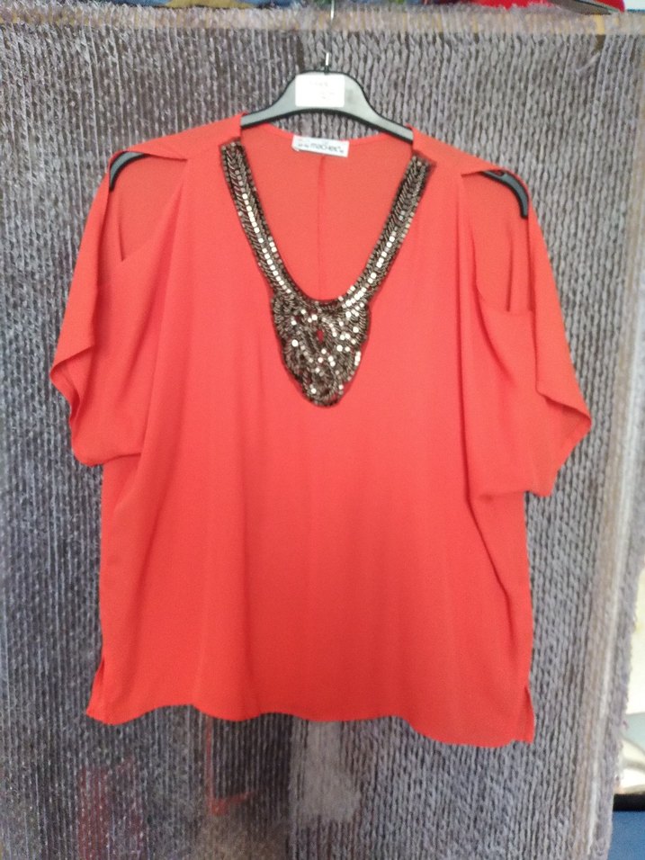 Kırmızı, parlak metal boncuk detaylı V yakalı, kısa kollu ve bol kesim mini bluz, yumuşak sentetik kumaştan günlük sokak stiline uygun.