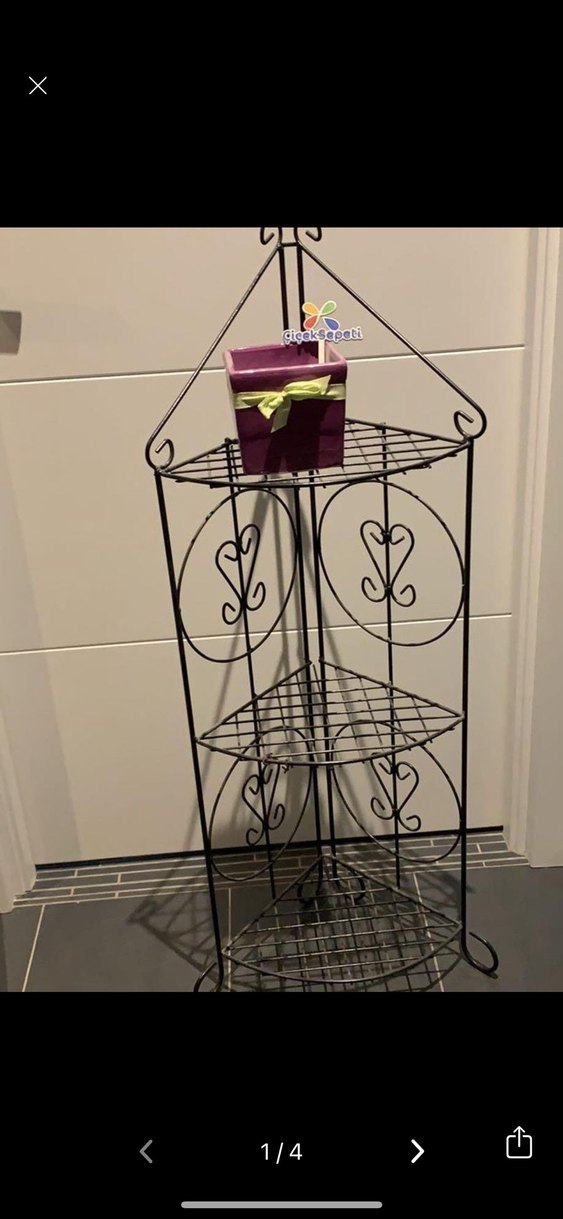 Üç katlı, siyah i metal köşe çiçeklik veya mutfak rafı, ve şık tasarıma sahip.