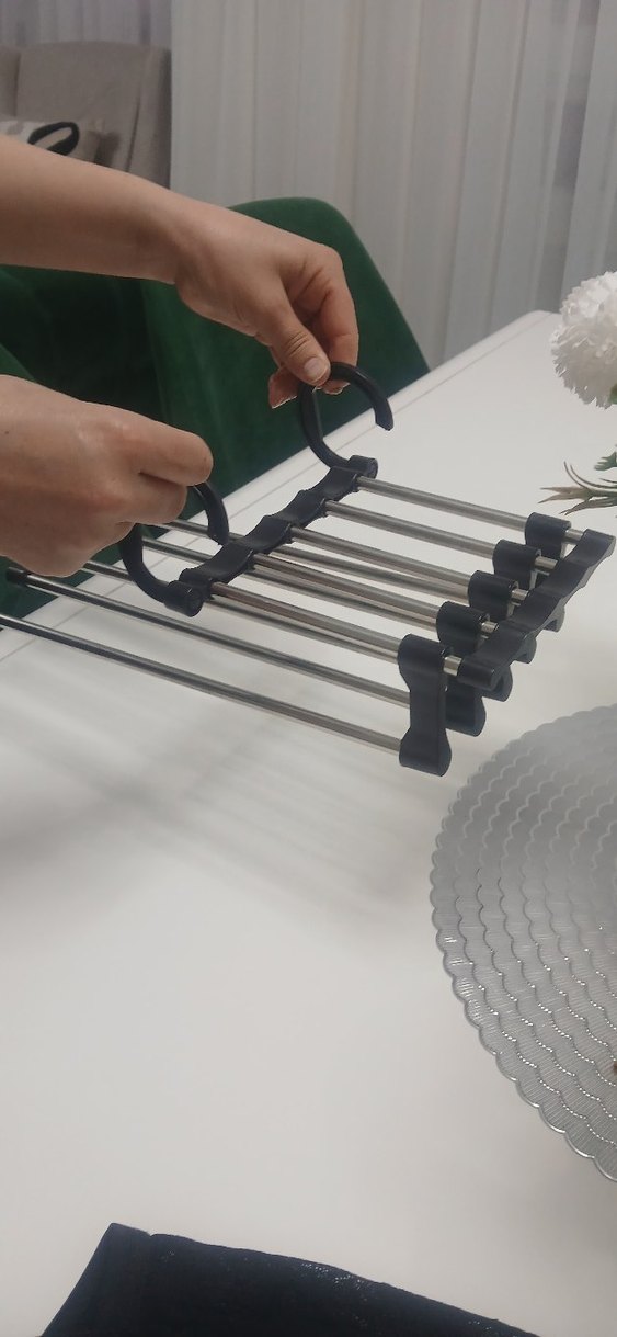 Gri kancalı ve khaki detaylı metal çoklu pantolon askısı, dolapta yer tasarrufu sağlar.