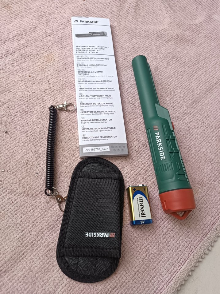 Parkside yeşil metal dedektör kalem, taşıma kılıfı, anahtarlık ve Maxell 9V pil ile birlikte gelir. ARKSIDE optik karakter tanıma özelliği içerir.