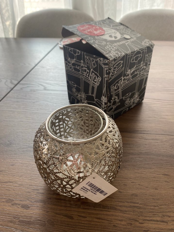 İnce işçilikle yapılmış gri metal dekoratif mumluk.