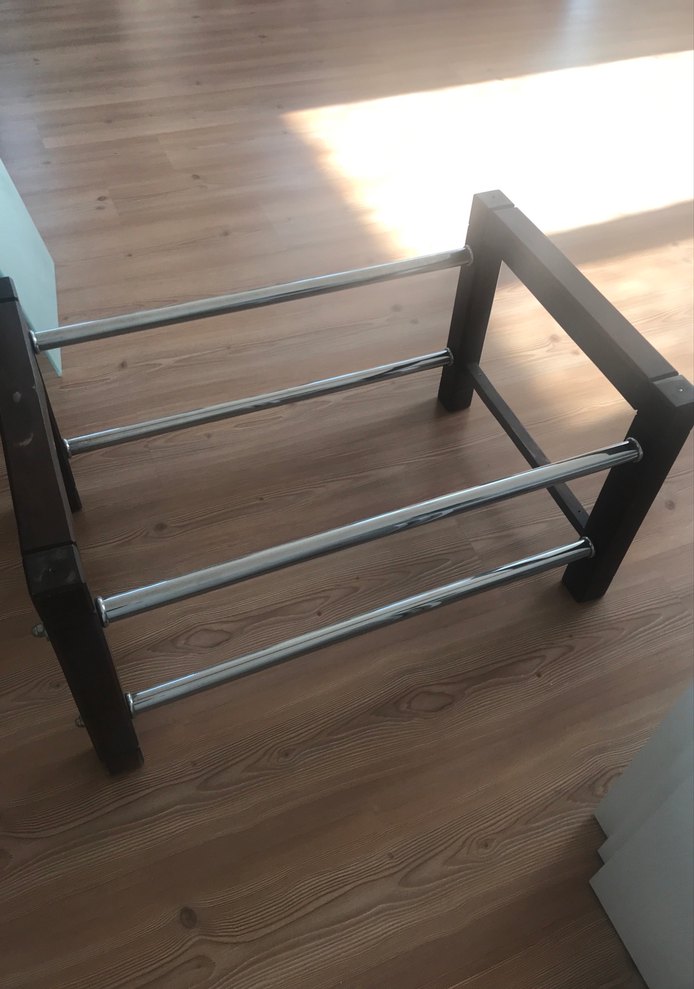 Kahverengi ahşap aksamı ,dayanıklı metal çubuklarla desteklenmiştir. Dikdörtgen orta sehpa , değişim ve eklemeler yapılarak kullanılabilir diye satışa sunuldu. Sadece masa aksamı bu şekildedir.Vidalı olduğu için sökülüp gönderilecektir.