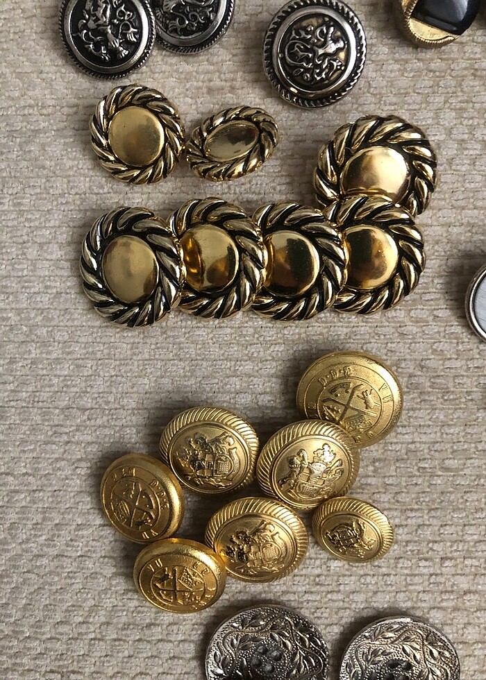 Ceketlerden sökülmüş sağlam sarı beyaz metal düğmeler
