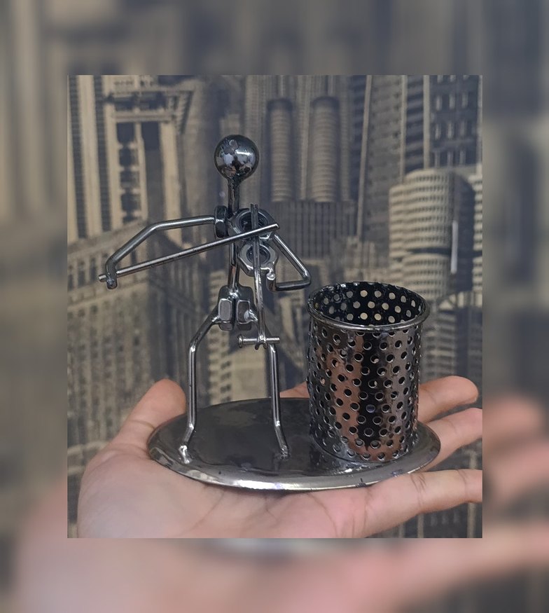 Gri ve siyah metalden yapılmış keman çalan figür, perforeli kalemlik ile birlikte yuvarlak taban üzerinde. Masa düzeni için uygun.