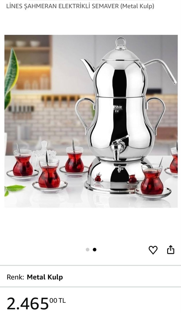 Parlak metal gövde ve metal kulplara sahip çaydanlık seti. Alt kısmında musluklu büyük demlik ve üstte küçük demlik bulunur. ☕Üç dört kez kullanılmıştır, küçük eve taşındım, tezgahta koymaya yerim yok.