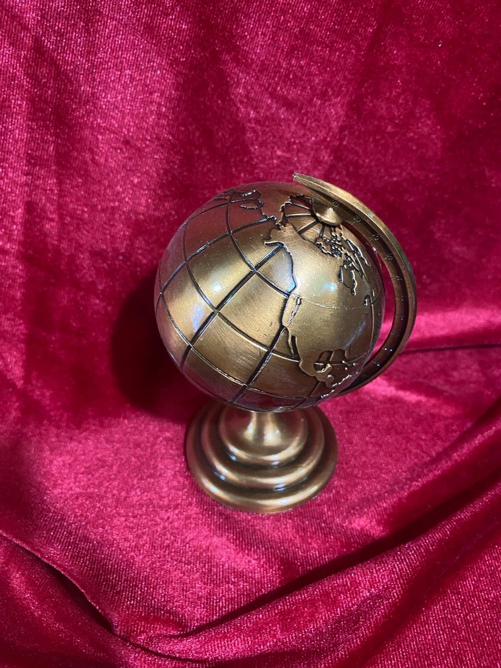 Parlak altın renkli küre şeklinde bir biblo. Yuvarlak taban üzerinde detaylı harita çizgileri ve kıtalar yer alıyor. Metal malzeme