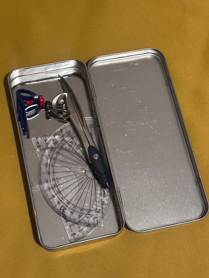 Gri metal kutuda altın detaylı, pergel, açıölçer ve bölücü içeren okul geometri seti.