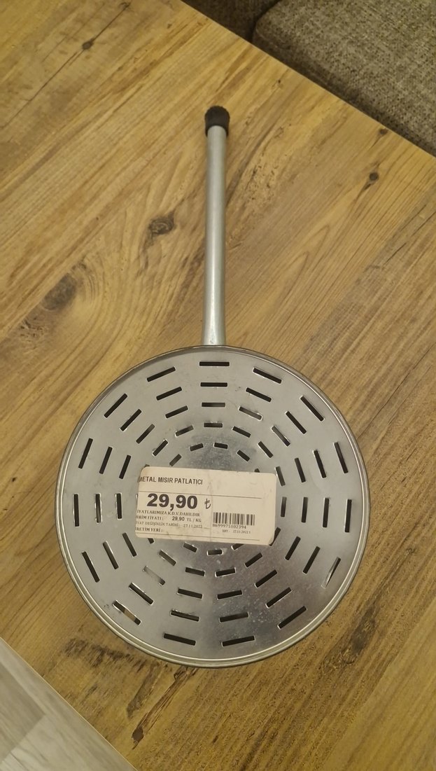 Uzun saplı, delikli yüzeye sahip bej ve gri renkli mısır patlatıcı