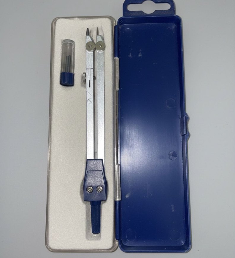 Gri metal pergel seti, yedek uçlar için küçük kutu ve mavi plastik kutu içinde saklanır.