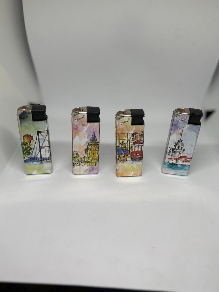 İstanbul'un simge yapılarıyla renkli ve sanatsal tasarımlı çakmak seti. Koleksiyon veya hediye için uygun .