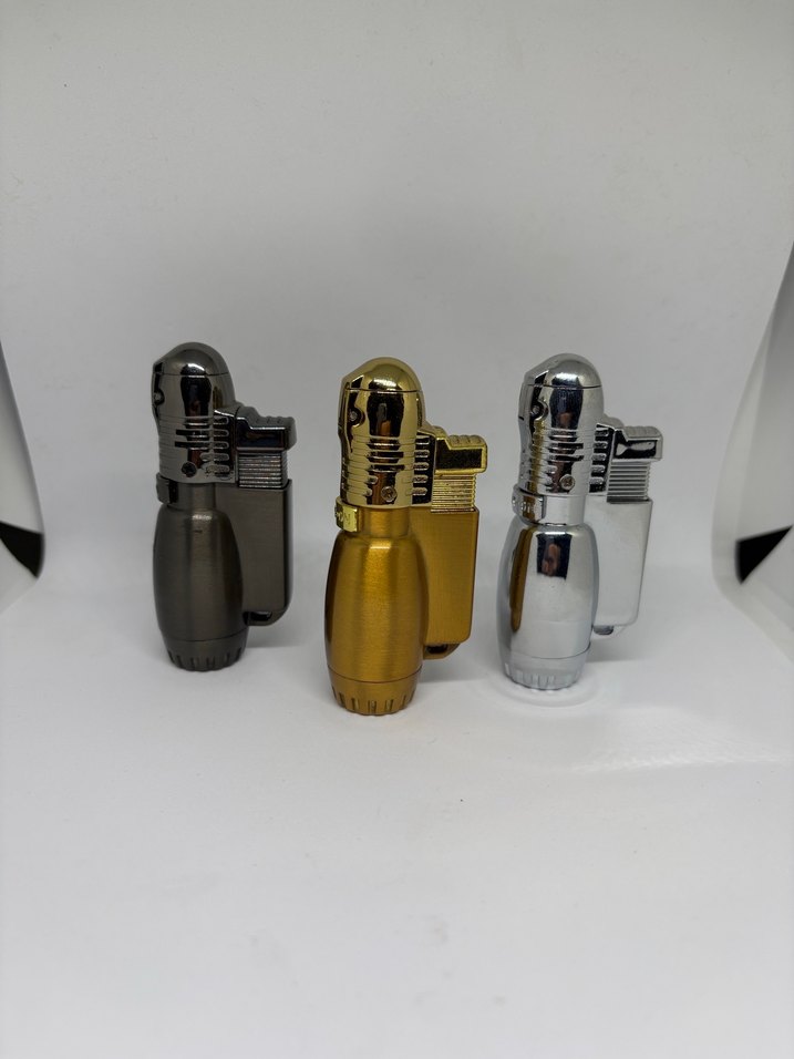 Gri, altın ve gümüş renklerde metal mini çakmak seti, şık ve kompakt tasarıma sahiptir.
