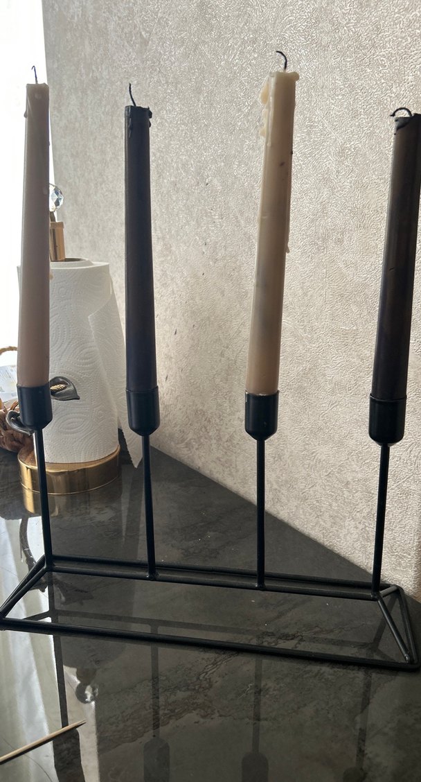 Dört adet uzun, ince bej ve koyu mumların yer aldığı siyah metal mumluk. Sadece şamdandır.