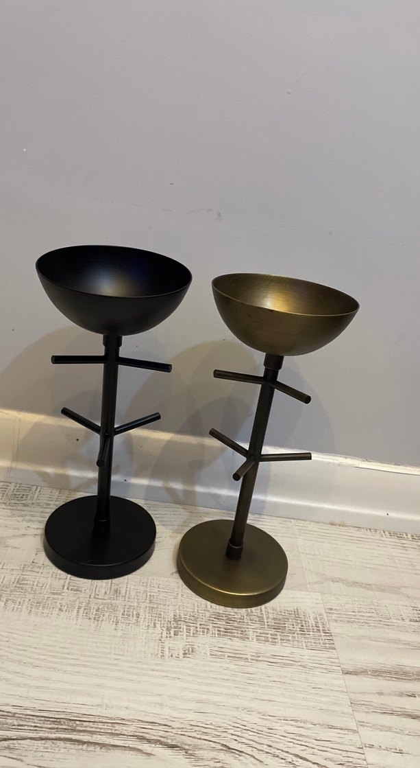 Siyah ve bronz renklerde, dal şeklinde kolları ve yuvarlak tabanları olan metal takılık seti. ️