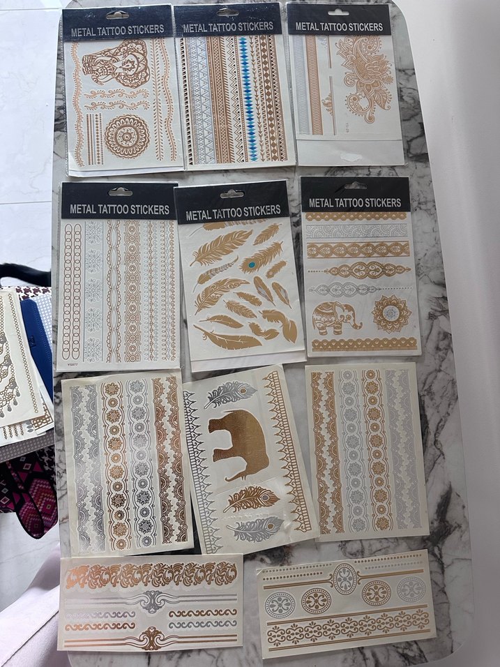 1 sayfa 150 TL, kesik sayfalar 50 TL Altın renkli metal dövme tırnak süslemeleri, geometrik desenler, tüyler ve hayvan figürleri içerir. ✨