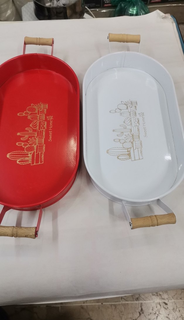 Ahşap saplı uzun metal tepsi iki renktir renk belirtiniz