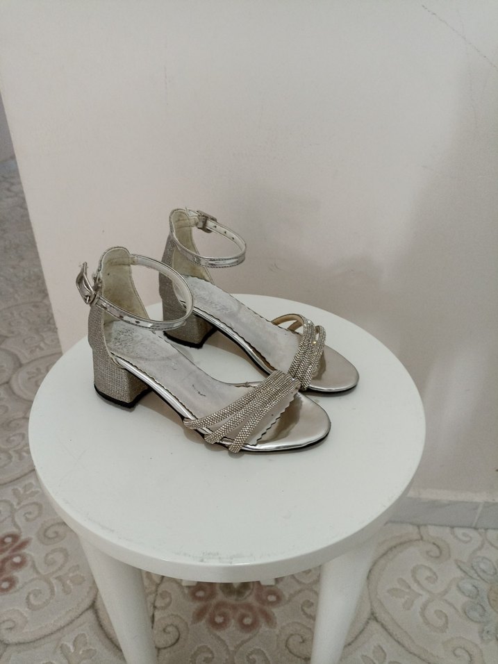 Metal tokalı, blok topuklu çocuk gece ayakkabısı, düğünler için uygun. çok girdiği için biraz yıpranma payı var fotoğraflarda gözüktüğünden farklı değil kullanılabilir durumda bu durumu fiyata yansıtıldı