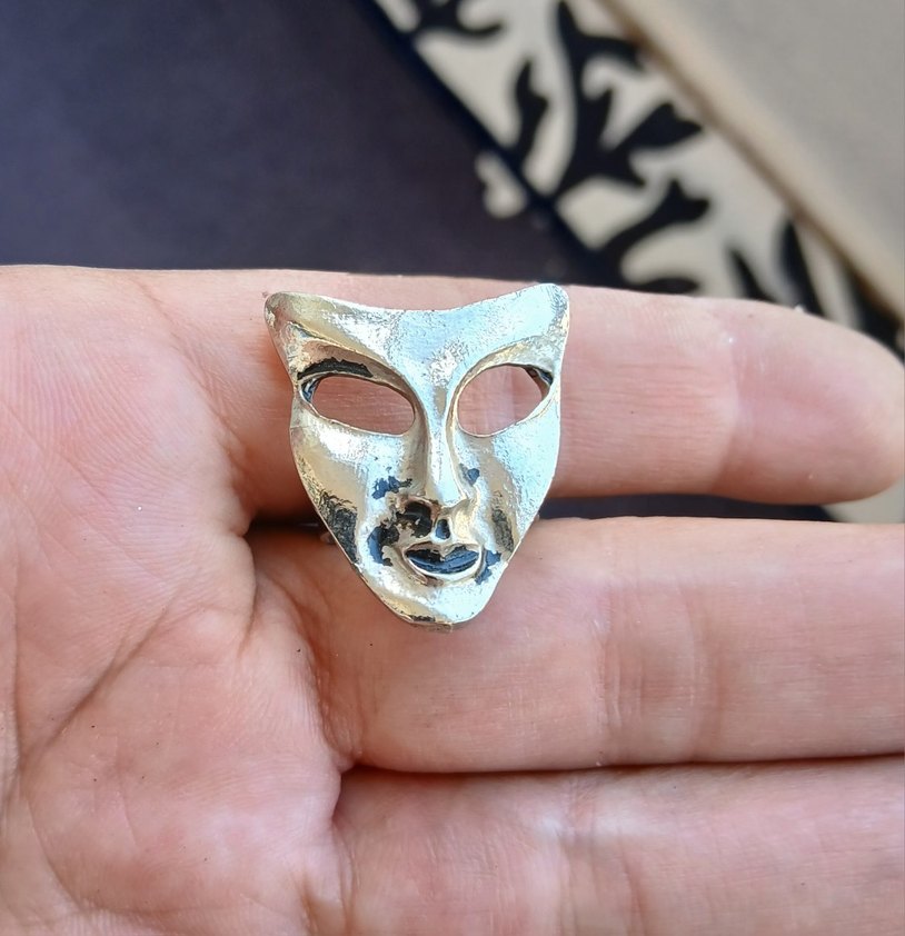 El içinde tutulan, boş gözlü, stilize yüz tasarımlı küçük gümüş renkli metal maske figürü.