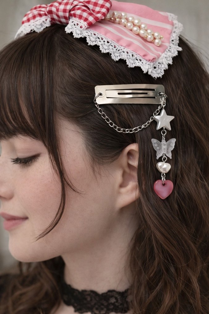 metal saç tokası, zincir üzerinde yıldız, kelebek, inci ve kalp figürleri ile nostaljik gotik bir tarz sunar. Bir çift fiyatıdır Toka 5cm N8