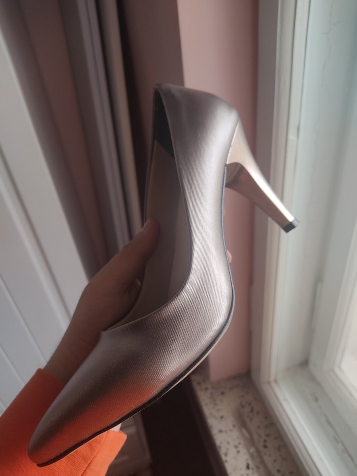 Metalik gri renkte, metal ince topuklu kadın ayakkabısıdır. Ofis için şık ve çağdaş bir tarza sahiptir. ✨