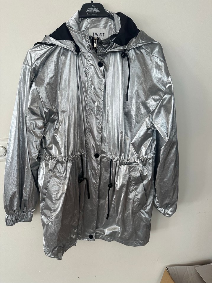 Metal görünümlü gri kadın yağmurluk, kapüşonlu ve gevşek kesimdir. Midi boyda olup sokak stiline uygun, sentetik kumaştan yapılmıştır. ️