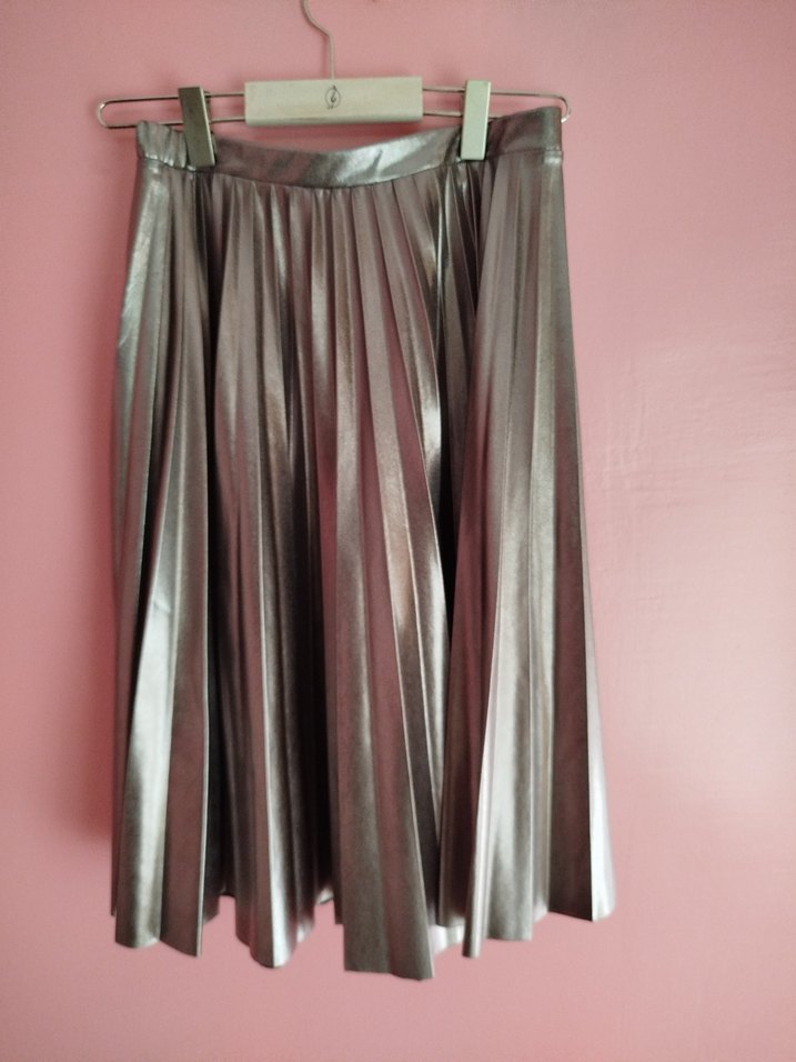 Metal görünümlü gri midi uzunlukta pilili etek, bol kesimi ve desen içermeyen yapısıyla çağdaş ve partiler için uygun tarz sunar. ✨