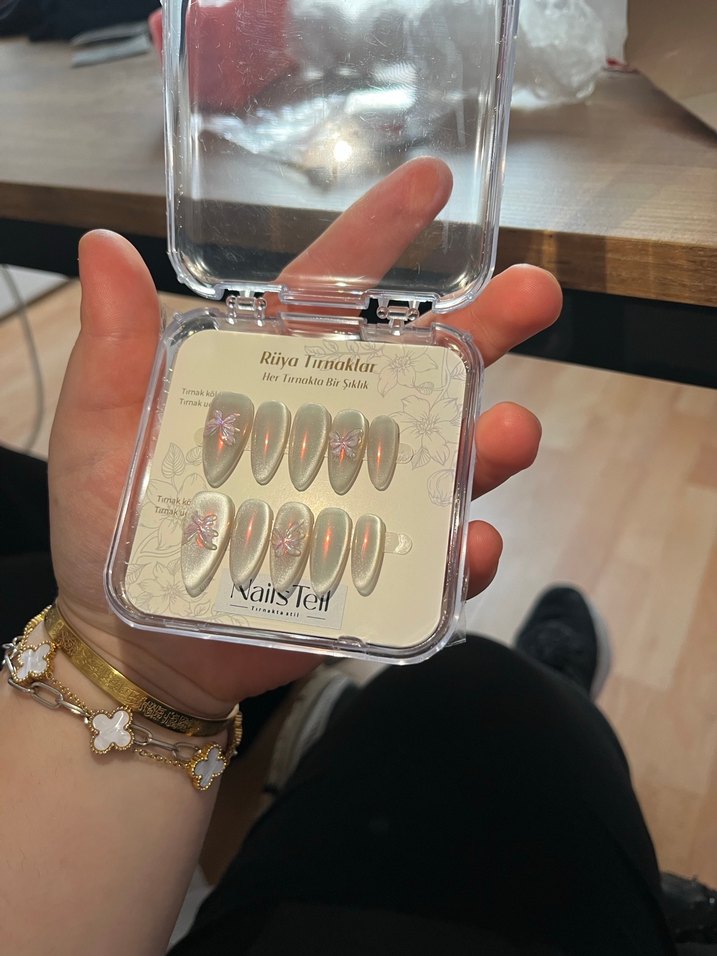 İnci–metalik tonlara sahip bu özel tasarım takma tırnak seti, normal ışıkta zarif ve sade, flaşlı çekimlerde ise renk yansımalı ve ışıltılı bir görünüm sunar. Kelebek figürleriyle birlikte tırnaklar hem feminen hem modern bir stil oluşturur. Flaşta oluşan yansımalar sayesinde fotoğraf ve videolarda çok dikkat çekici durur. Özellikle gece davetleri, özel günler ve sosyal medya çekimleri için idealdir. Öne Çıkan Özellikler • İnci–metalik nude renk • Kelebek figürlü zarif tasarım • Flaşta renk yansımalı parlaklık • Uzun ve şık form • Hafif ve rahat kullanım • Tekrar kullanılabilir Paket İçeriği • 10 adet takma tırnak (2 el set) • Takma tırnak yapıştırıcı bantlar • Tırnak törpüsü • Tırnak itici (manikür çubuğu) • Temizleme pedi Evde kolay uygulanır, profesyonel işlem gerektirmez.