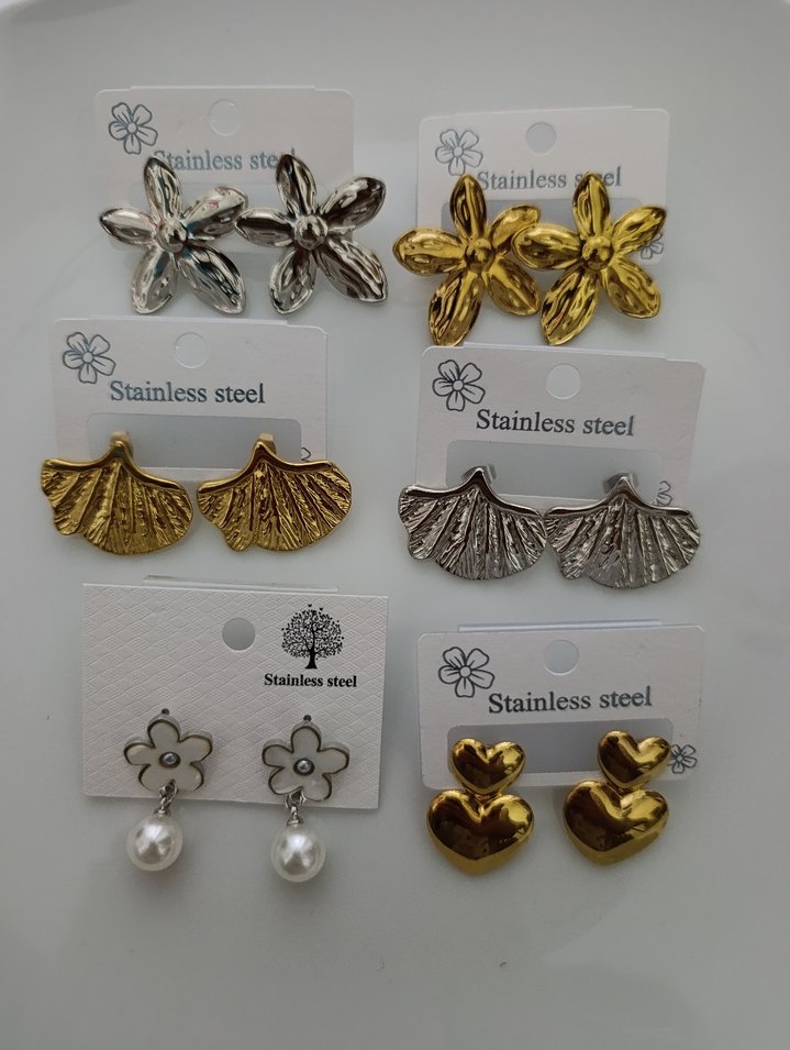 Altın ve gümüş renkli, kısa ve parlak metalik çiçek ve kalp desenli küpeler. Paslanmaz çelikten, günlük kullanıma uygun.