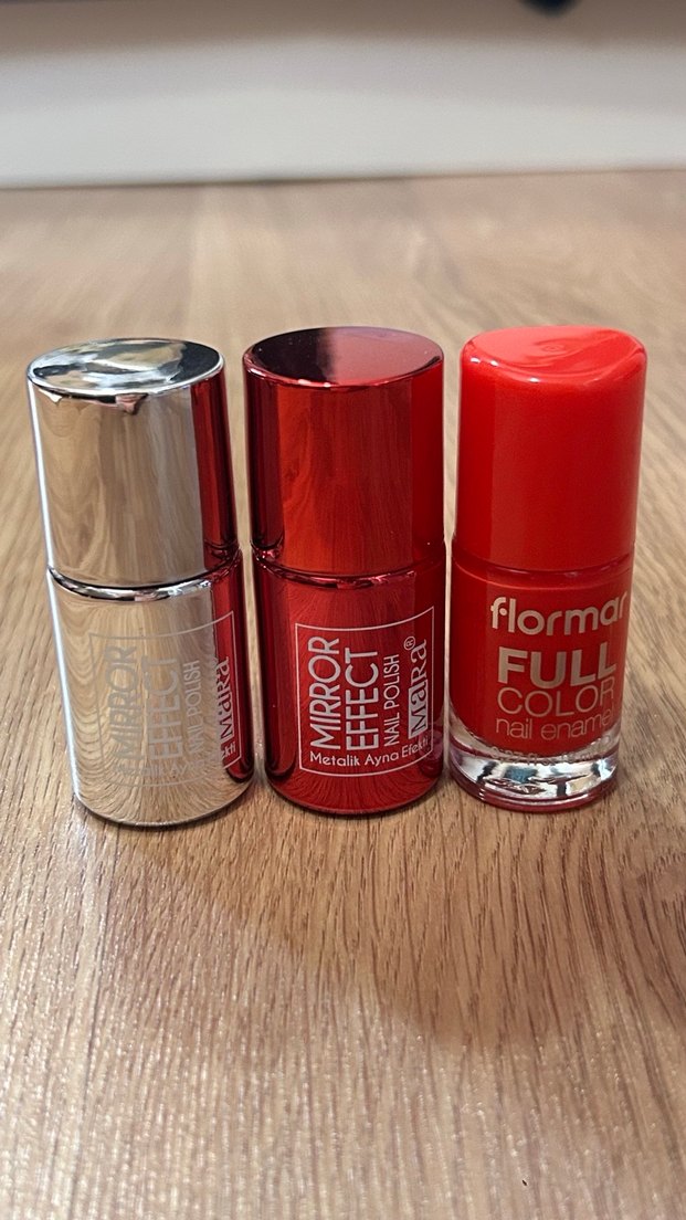 Flormar markasına ait üç adet parlak kırmızı oje seti. Aynalı efekt ve tam renk seçenekleri sunar. Canlı tırnaklar için ideal. 2 adet Metalik bir adet nar çiçeği oje