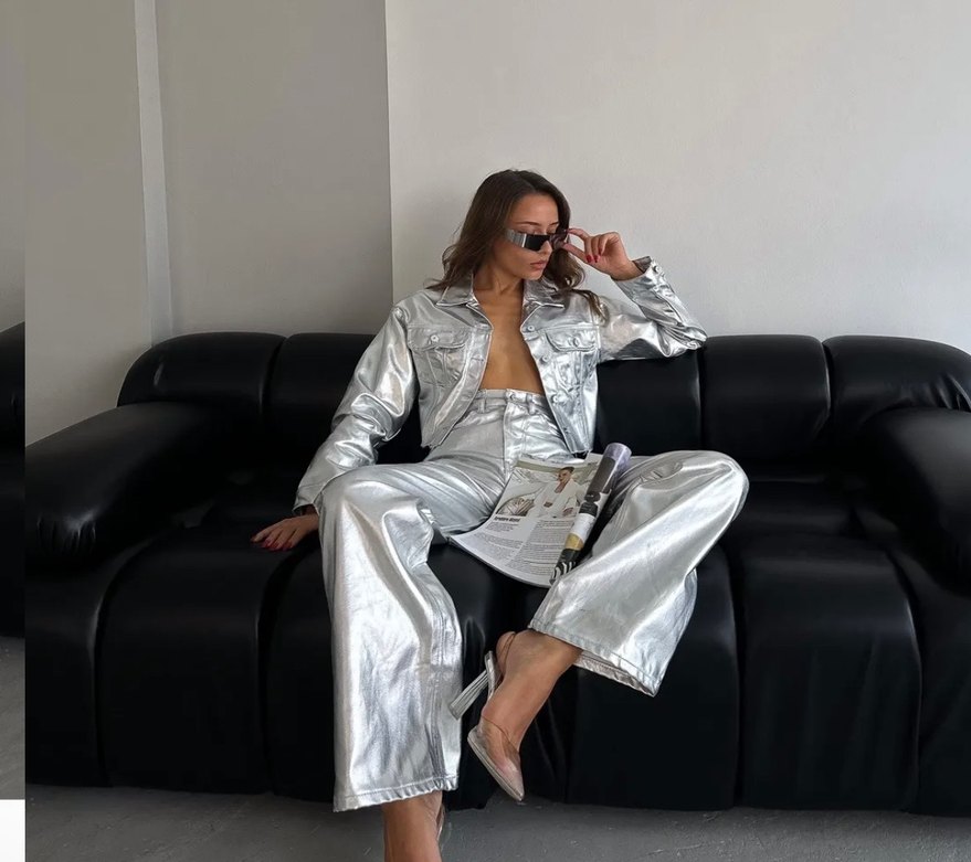 Metalik parlak baskılı silver gold denim ceket. Gömlek yaka.