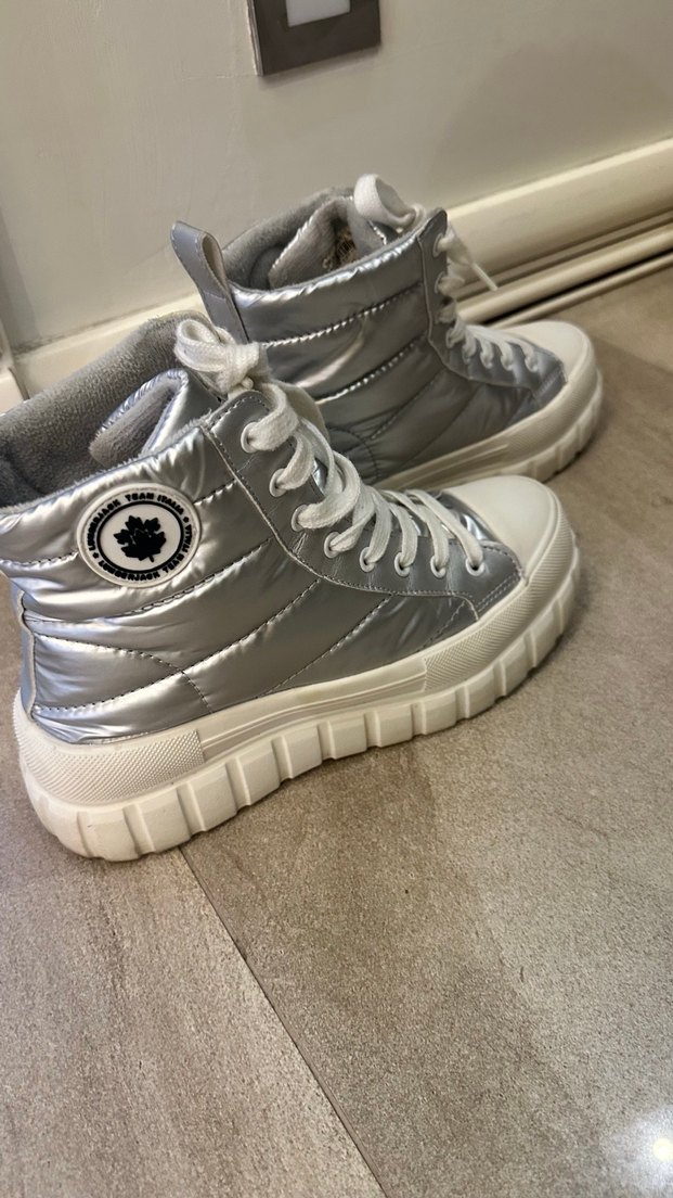 Metalik renkte, platform topuklu ve lastik tabanlı kadın botu. Aşırı rahat içi pamuklu sıfır gibidir.