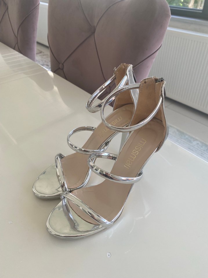 Parlak metalik stiletto topuklu, kemerli tasarımı ve çağdaş stiliyle romantik akşamlar için uygun.✨