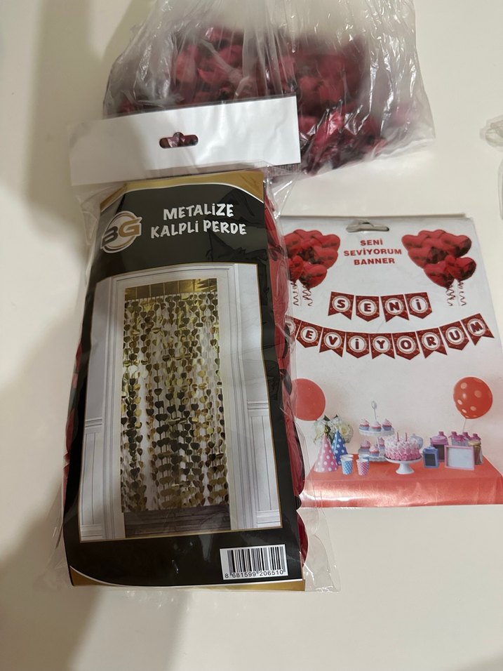 Kırmızı metalize kalpli perde ve 'Seni Seviyorum' yazılı pankart içeren parlak parti süsü. Her biri adet 130 liradır .