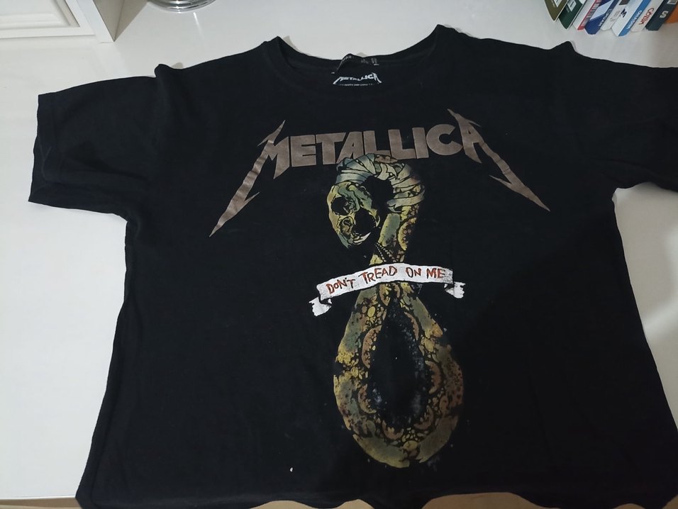 Metallica baskılı, siyah deri hamile tişörtü, fitted kesim, yuvarlak yaka ve askılı kollara sahip, rock punk tarzına uygun.
