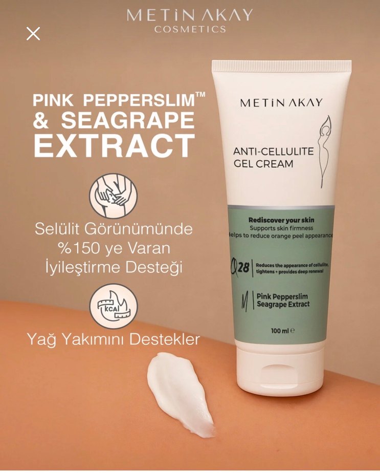 Metin Akay Selülit Karşıtı Jel Krem, Pink Pepperslim ve deniz üzümü özü ile yağ yakımını destekler, selülit görünümünü %150'ye kadar iyileştirir.