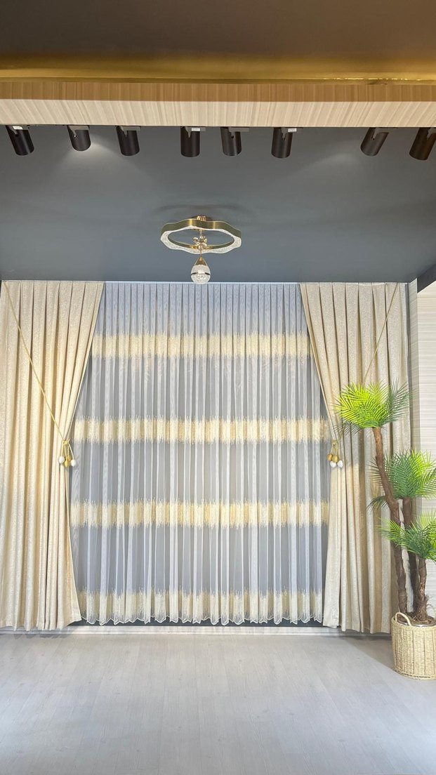 en boy ölçüsü vererek fıyat alabılırsınız. Bej renkte, modern klasik tarzda ve hafif batik desenli perde, mekâna zarif bir doku katıyor.