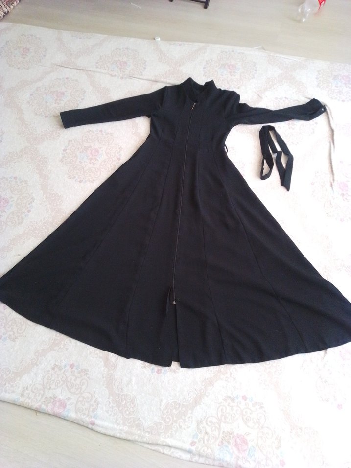 Uzun siyah elbise, yüksek yakalı ve uzun kolludur. Yumuşak ve sıcak kumaştan, drapeli tasarıma sahiptir, gotik tarz için uygundur.