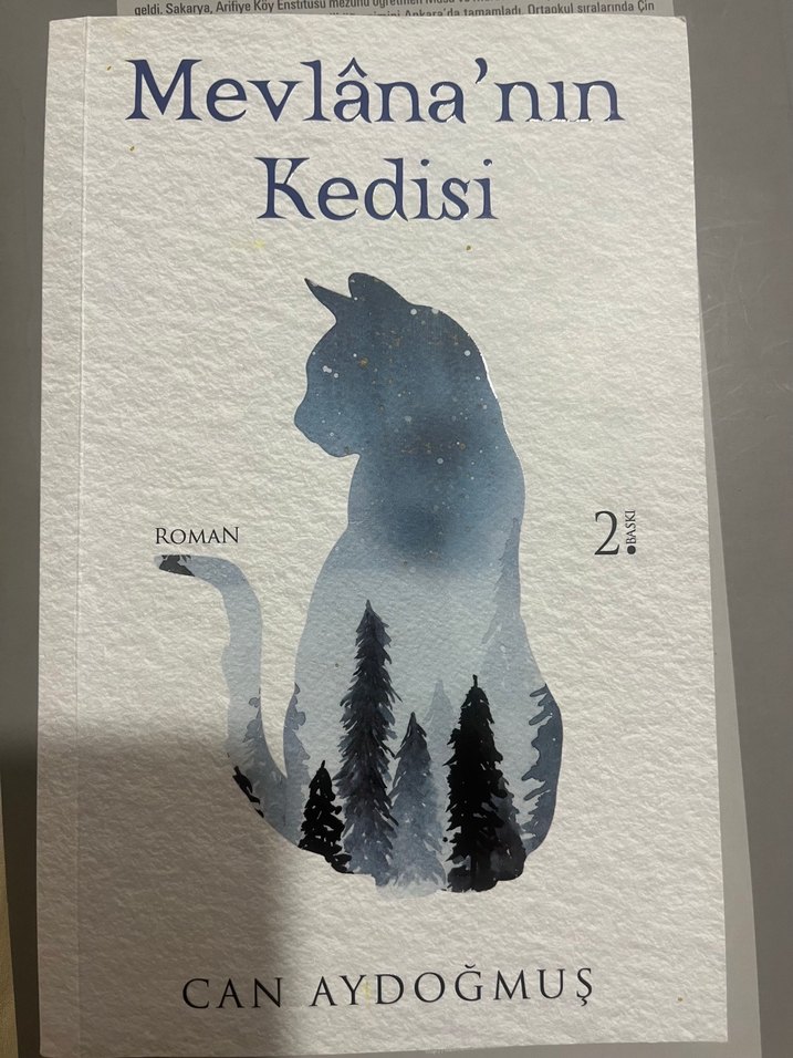 Can Aydoğmuş'un 'Mevlâna'nın Kedisi' adlı romanı, kedinin silueti ve orman temalı kapağıyla dikkat çekiyor.