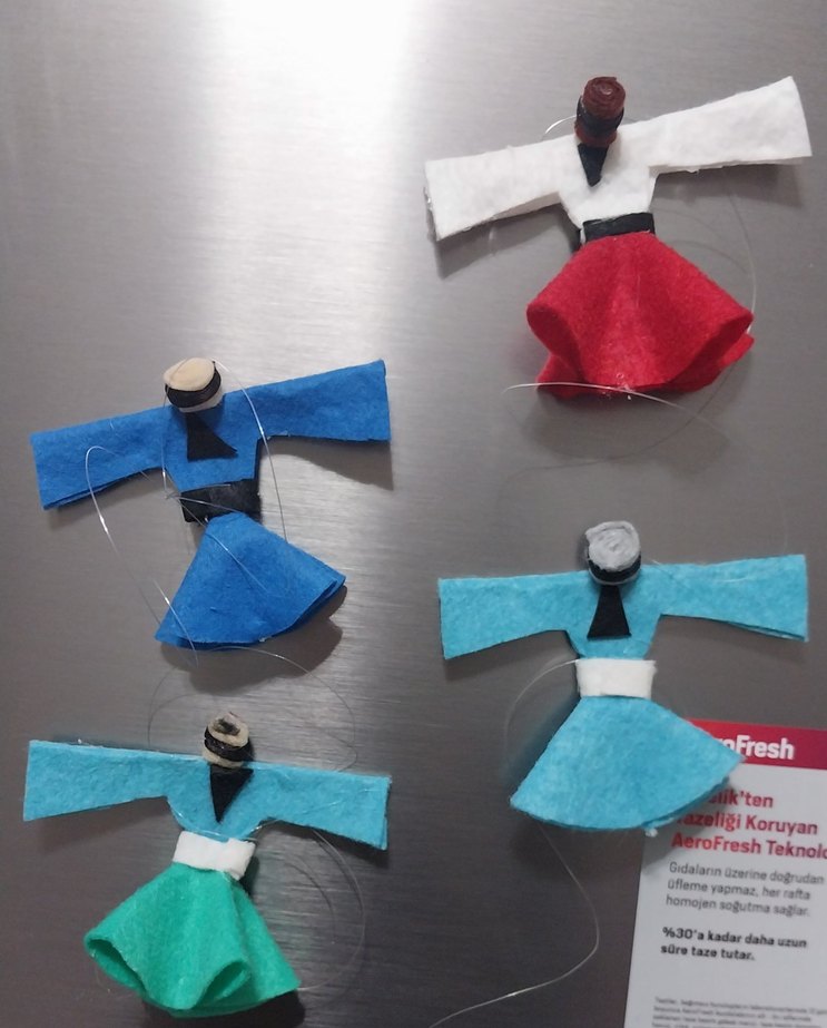 Canlı renklerde farklı kumaşlardan yapılmış geleneksel mini figürler. Her figürün kendine özgü kıyafet ve başlık detayları bulunur.