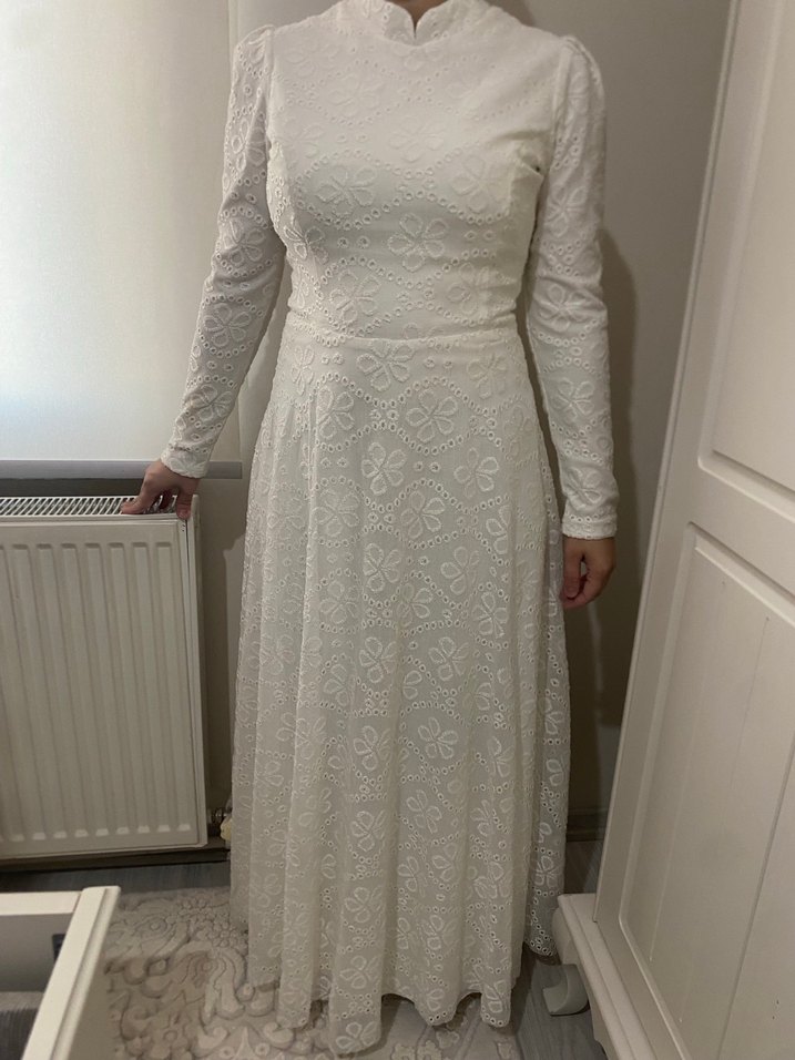 Sadece bir saat giyildi.Bu dar kesim beyaz elbise, yüksek yakası ve uzun kolları ile vintage esintili işlemelere sahip klasik ve zarif bir siluet sunar.