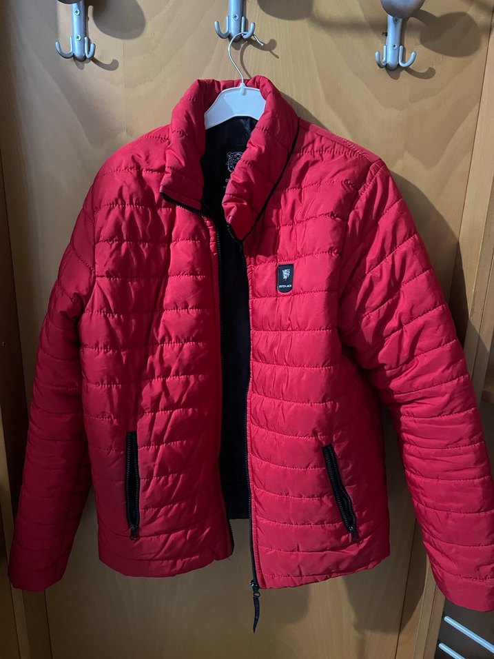 Kırmızı renkli, fermuarlı ve cepli, uzun kollu, yumuşak ve sıcak kumaştan temiz kullanılmış L bedendir