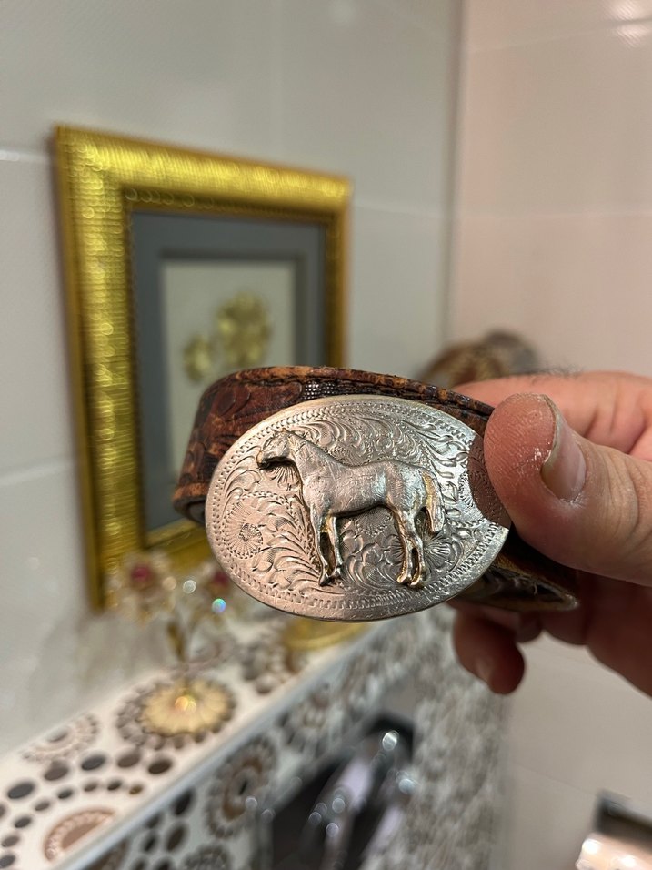 Parlak kahverengi deri kemer, tokasında nostaljik at figürü bulunur. Eski tarz ve karşı kültür görünümü sağlar. Ürünümüz usa ürünüdür gayet iyi durumda sorunsuz