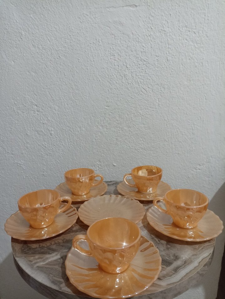 Kabartmalı desenli, bej renkli 5 adet ORİJİNAL kahve fincanı ve 6 adet tabagi mexico termocrisa marka orijinal fincanın birtanesi anchor hocking marka sadece 1 fincan eksiktir