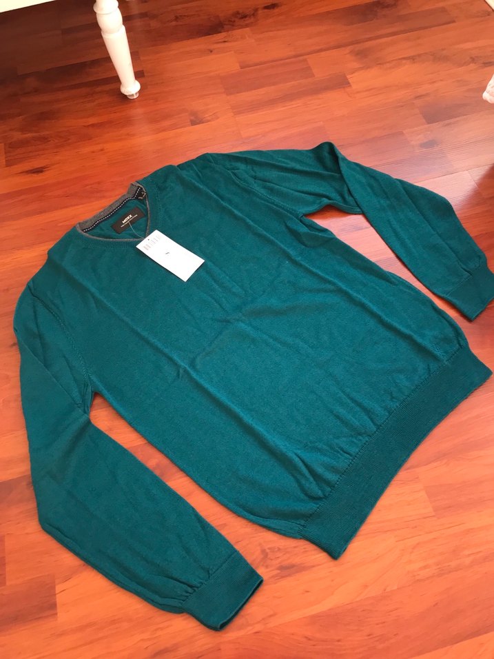 Uzun kollu, bisiklet yaka ve salaş kesime sahip erkek yeşil kazak. Yumuşak ve sıcak kumaştan, günlük sokak stili için uygun.