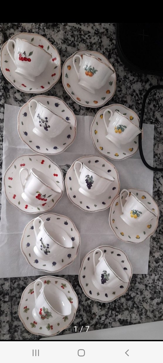 Beyaz porselen fincan ve tabaklar, çeşitli renklerde narin meyve desenleriyle. Her fincan özgün meyve deseni ve ince altın detaylı tabakla birlikte. #karaca #fincan