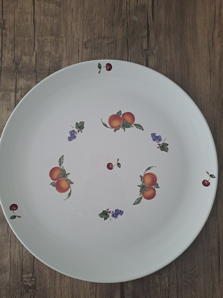 Beyaz tabak üzerinde şeftali, kiraz ve üzüm desenleri bulunan meyve desenli tabak. ️ Temiz ve sağlamdır pasta sunum tabağı boyutu 32cm