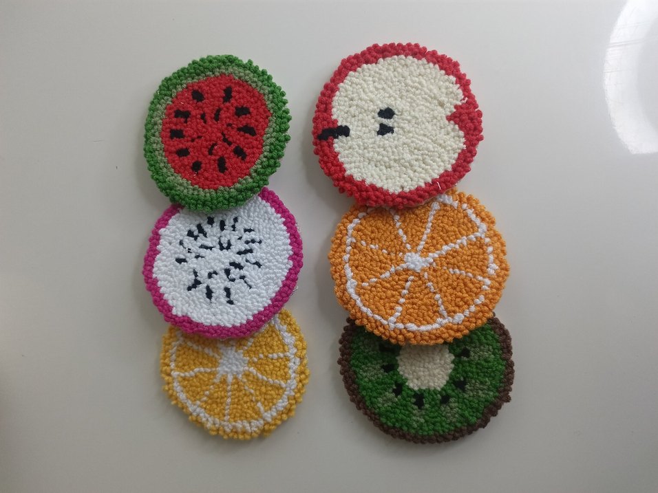 Canlı renklerde ve dokulu yüzeylere sahip, çeşitli meyve şekillerinde el yapımı punch bardak altlıkları, mutfağınıza eğlenceli bir dokunuş katıyor. Adet fiyatidir istenilen renk ve modele göre özel tasarlanir.